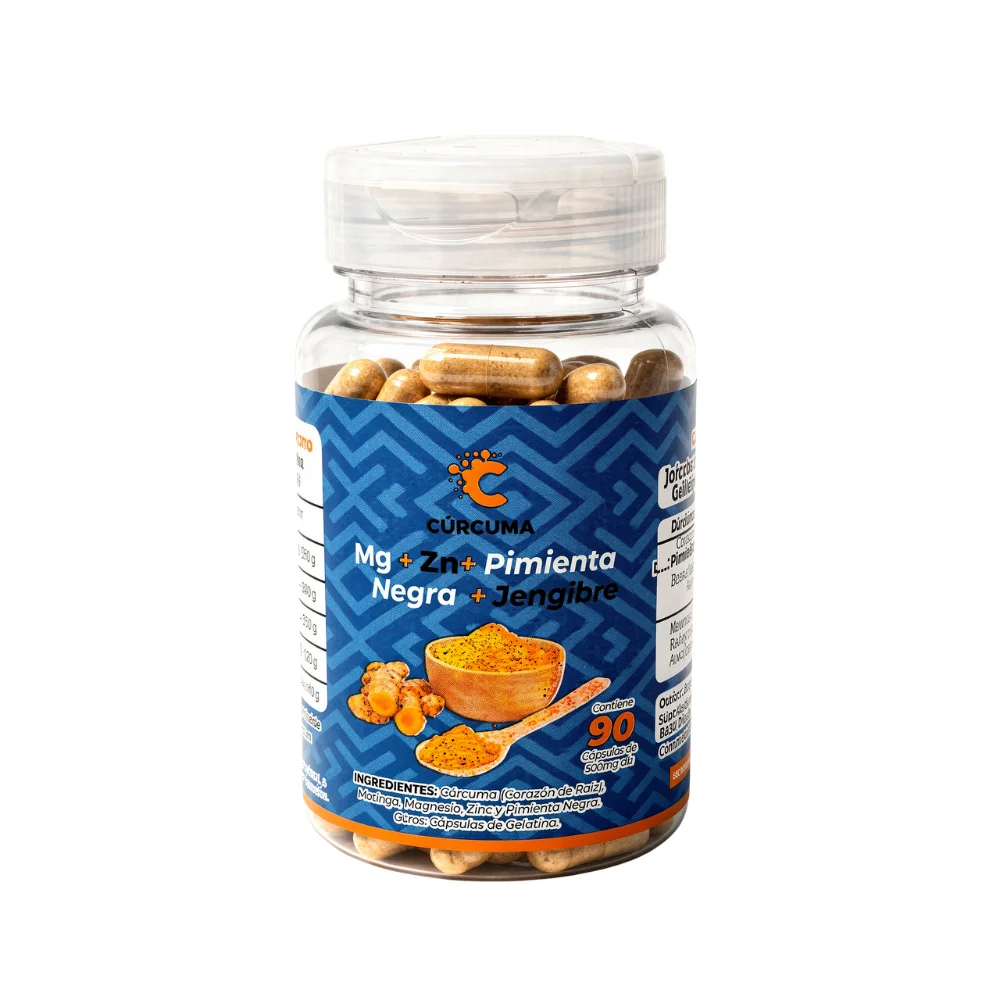 Fórmula integral con cúrcuma concentrada y jengibre, enriquecida con zinc y magnesio para apoyar energía, digestión y bienestar diario.